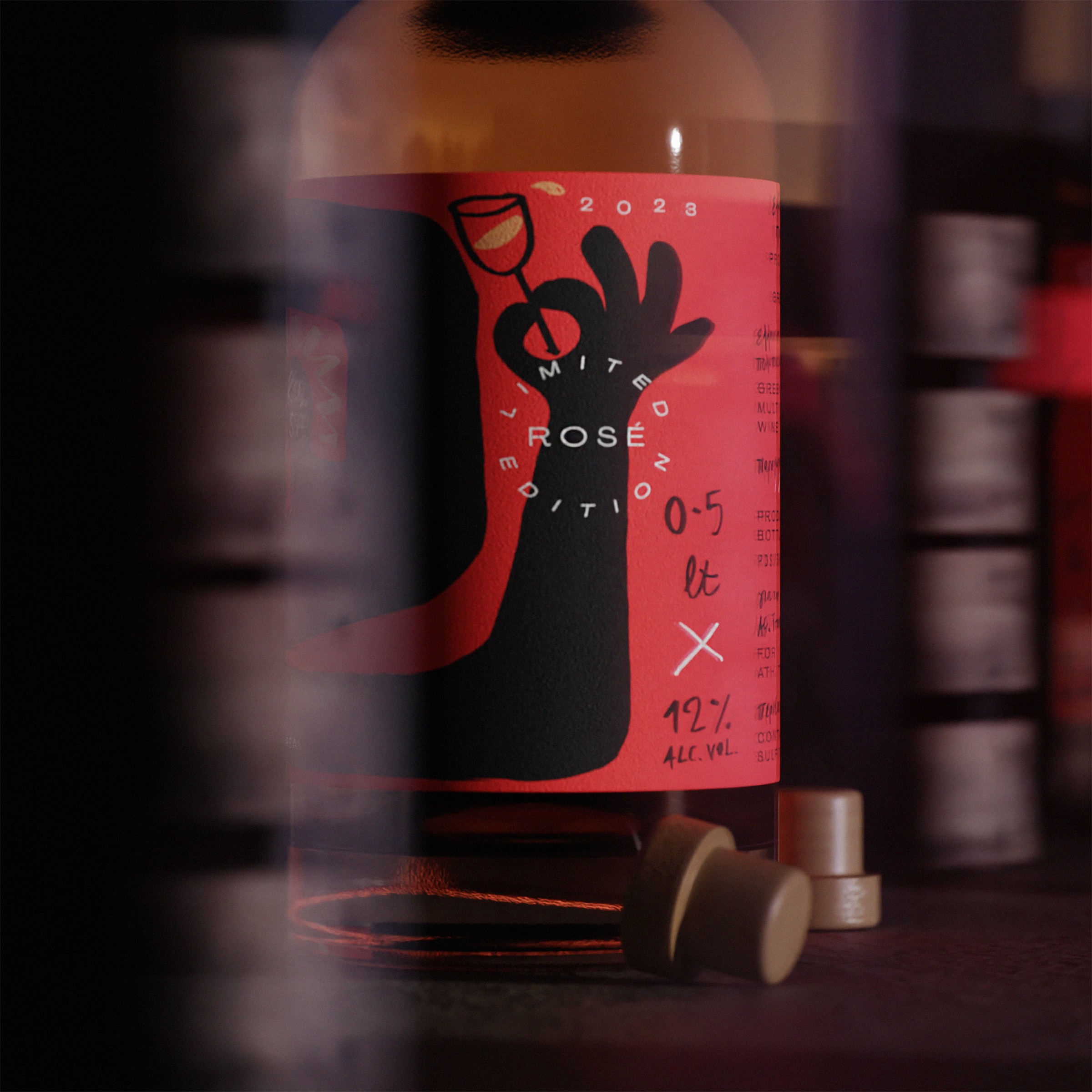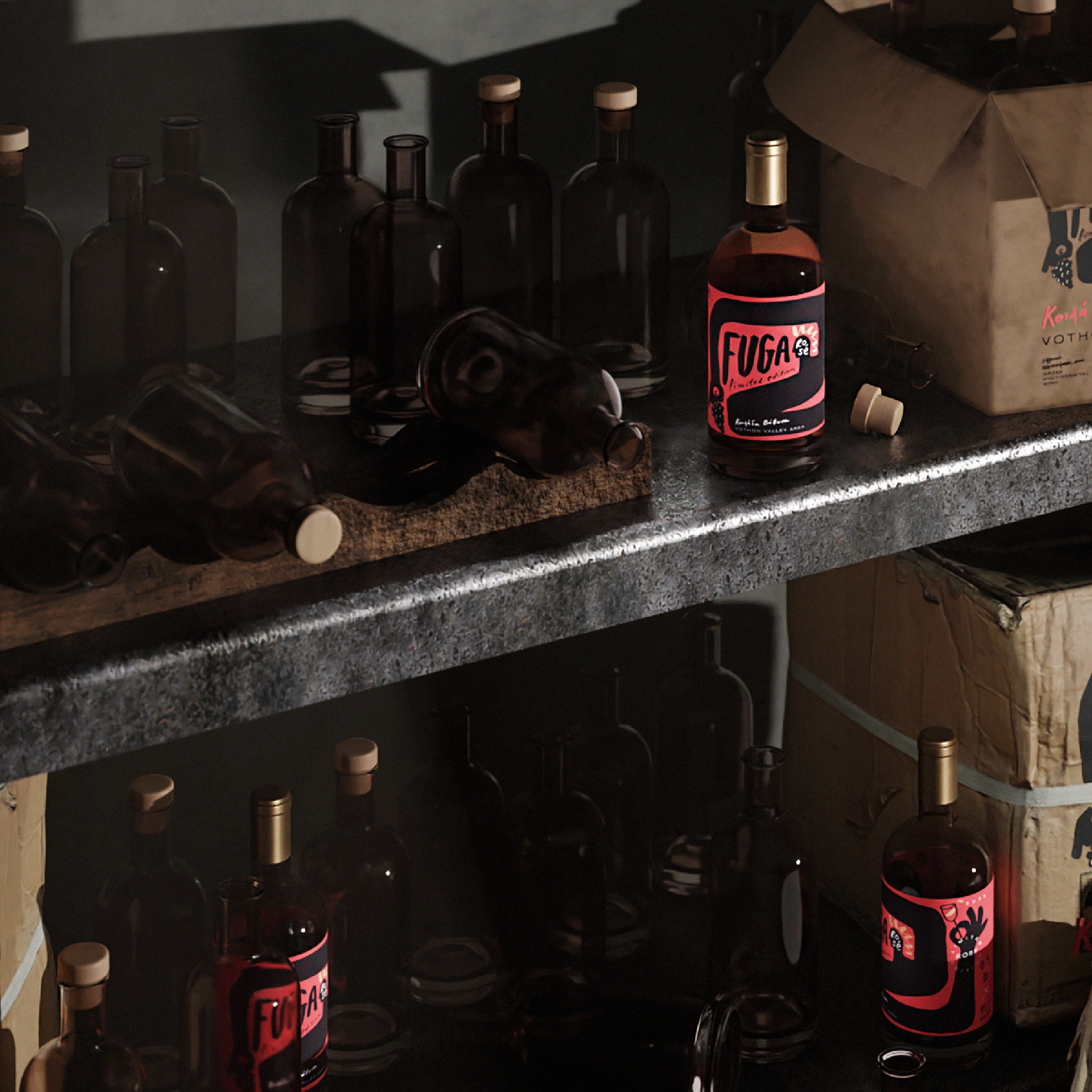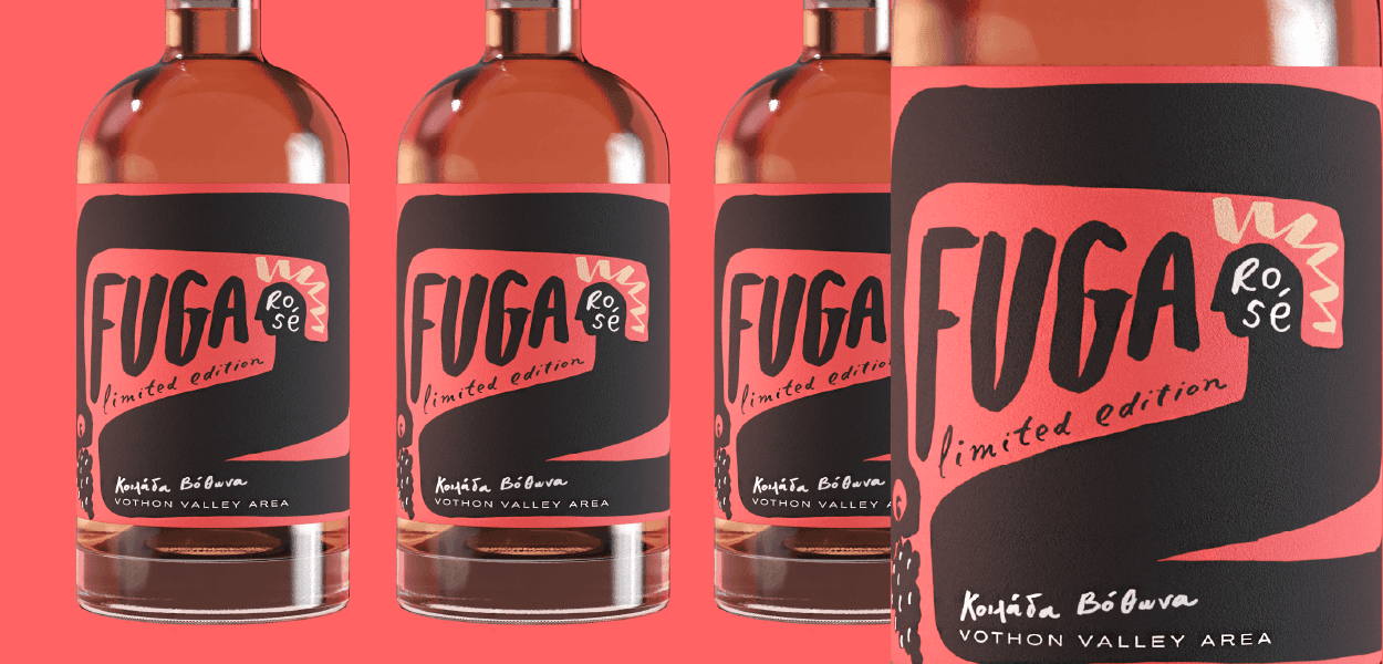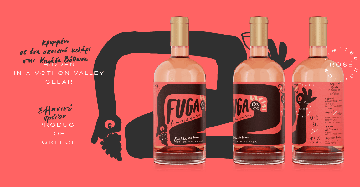 The visual language translates the feeling of descending into a shadowed cellar, where time slows and light fades, into a contemporary graphic system. Darkness becomes a central design element, allowing color, texture, and typographic details to emerge with intensity and restraint. The label balances minimal structure with expressive gestures, suggesting both elegance and mystery. Instead of celebrating brightness typically associated with rosé, Fuga embraces contrast, positioning the wine as something rare, intimate, and unexpected. The result is a packaging system that frames the bottle not as a seasonal product, but as a hidden object of discovery. A rosé defined by depth rather than lightness.