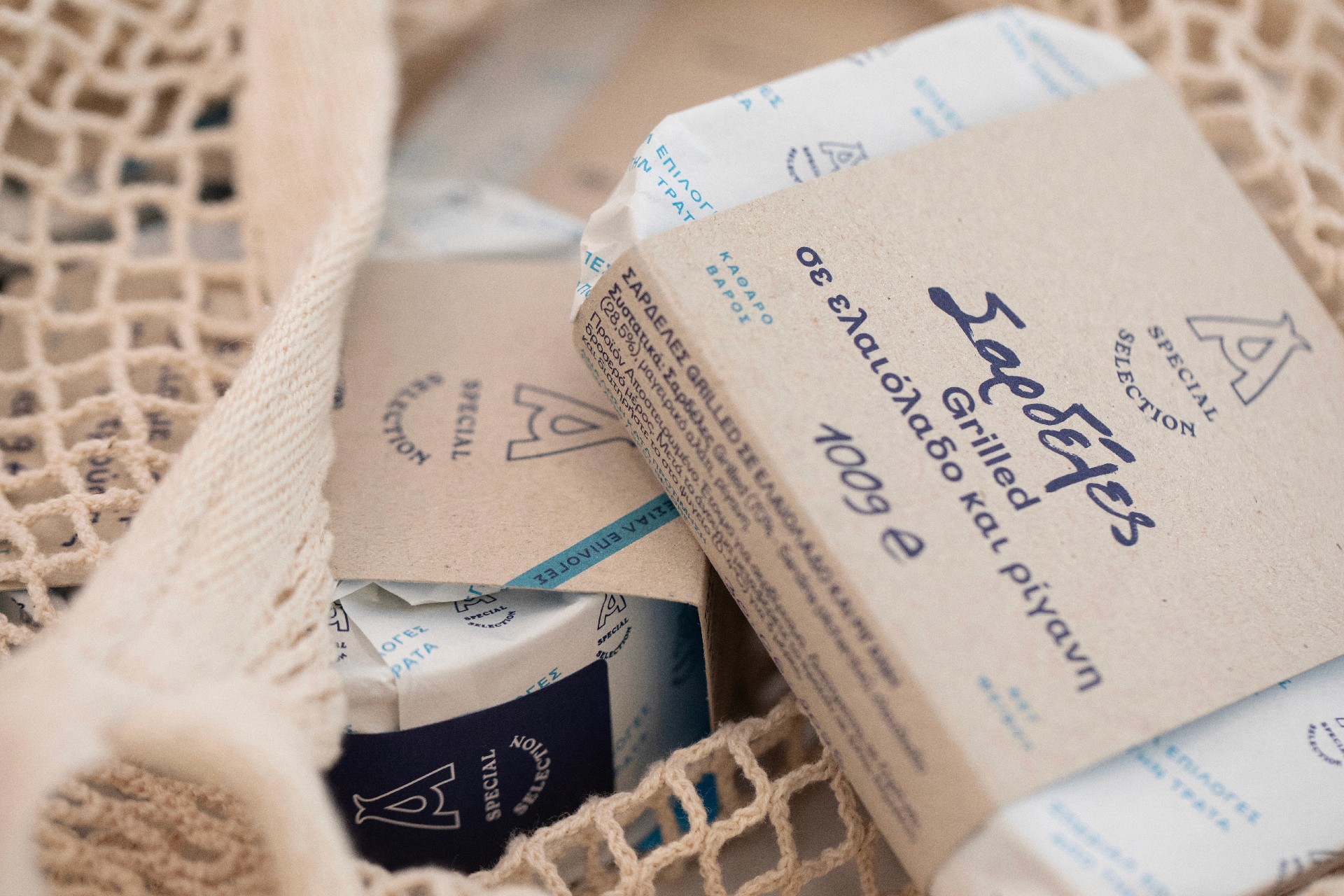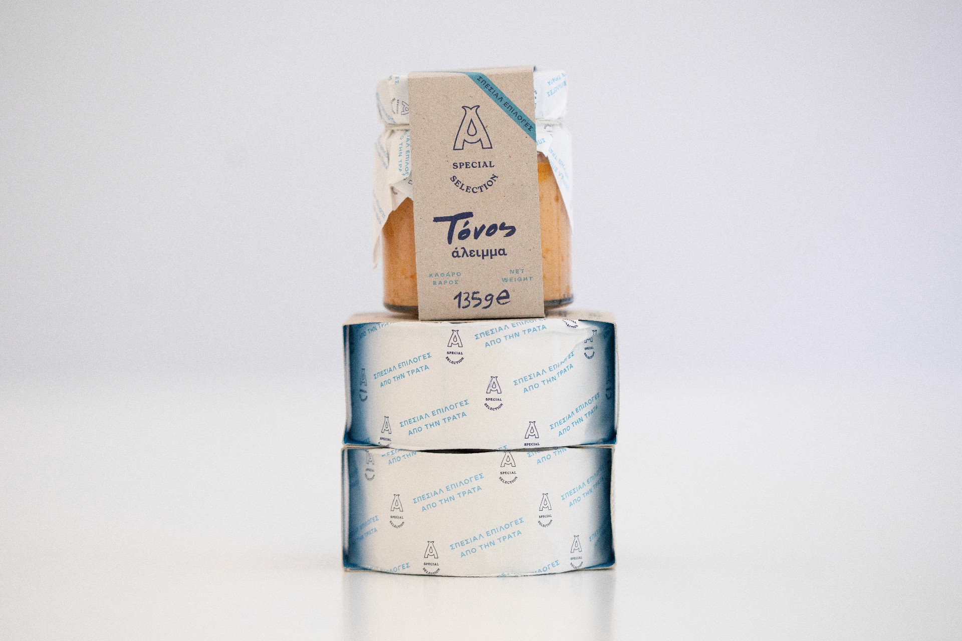At the end of 2022, Trata entered the newly renovated historic Modiano Market. As part of this presence, there was a need to create a new product line—an exclusive range with a premium deli character. A key requirement was to find a way to produce the packaging without printing directly on the containers, due to the limited quantities. The historic identity of Modiano Market played a significant role in our inspiration, setting as a core objective the preservation of tradition while expressing it in a contemporary way. The classic grey butcher’s wrapping paper, traditionally used by fishmongers for fresh fish, became a central reference point for our visual language. Using light grey paper and the existing “Special Selection” symbol in repetition, we established a direct link to this source of inspiration. With a bold, rough, hand-drawn type style, we capture the “catch”—the handwritten naming of each key ingredient—to evoke a sense of craftsmanship and personalization. The color palette steps away from the conventional tones found in fish markets while still maintaining a subtle connection. The resulting packaging series conveys a handmade quality through both the materiality of the packaging and the development of a “written-by-hand” graphic expression.